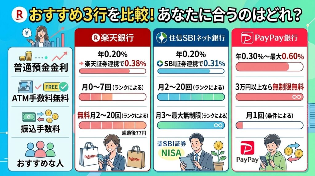 ネット銀行初心者が最初に選ぶべき銀行として、住信SBIネット銀行・楽天銀行・PayPay銀行の3行を比較します。